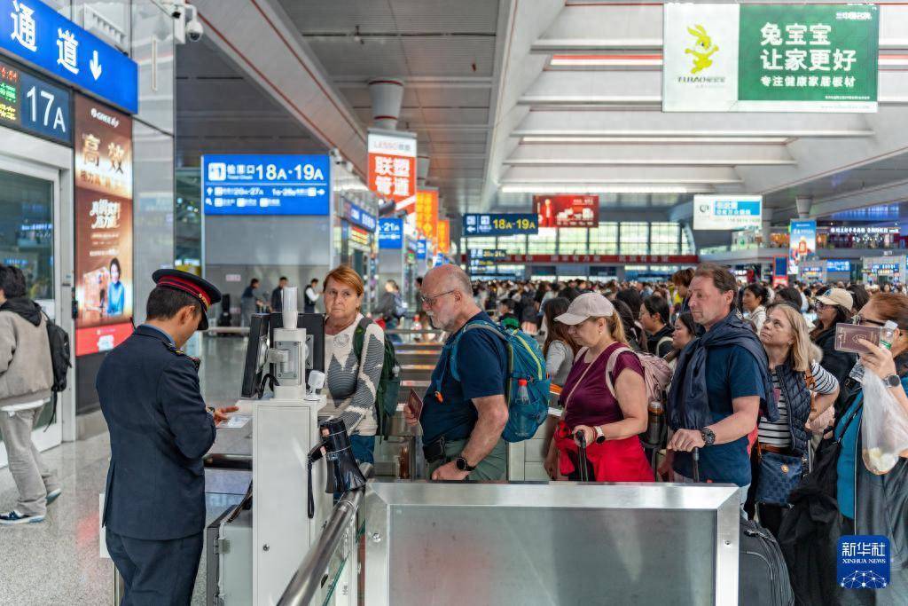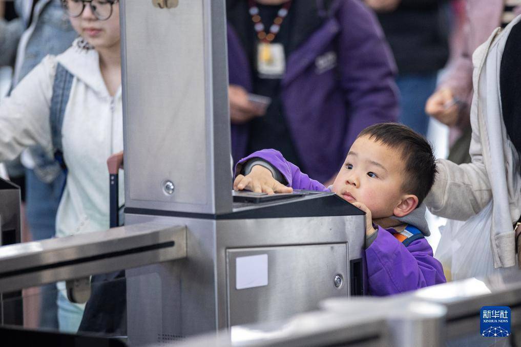 4月3日,外籍旅客在贵阳北站候车室检票。